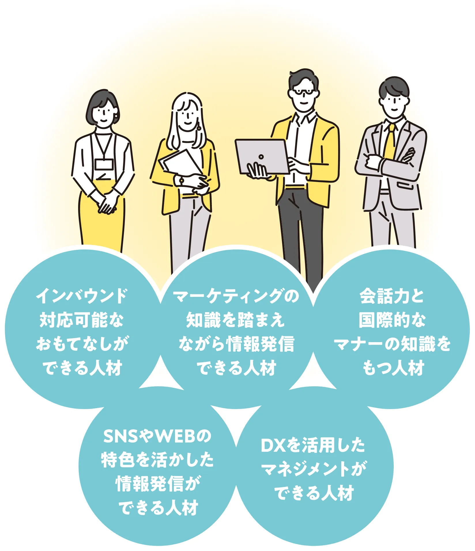 本講座は、「専門職業人材の最新技能アップデートのための専修学校リカレント教育推進事業」の一環として文部科学省から委託されたものです。教育機関や教育機関所属学識者、企業・団体、行政機関等と開発した「今求められている講座」を、山口県内の観光・料飲・サービス業に就業している方に向け開講し、同業界で活躍できる人材を育成することで、人材不足や生産性の向上、インバウンド対応などの課題解決を目指します。